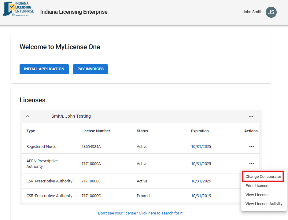 APRNs may now login to their MyLicense One account and use the Change Collaborator Action Item. Once you have submitted your Change Collaborator request via your MyLicense One account, the selected LP must review the request in their own MyLicense One account. This request will appear in the Licensed Practitioner's Activity Panel in their MyLicense One account.