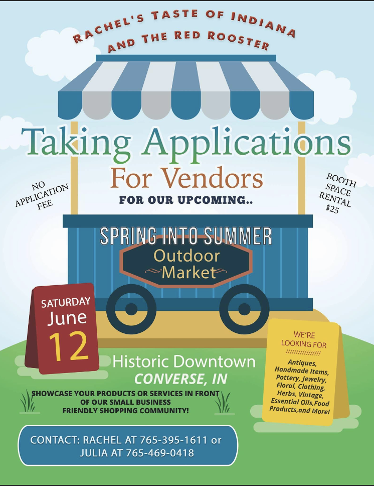 oin Rachel's Taste of Indiana and The Red Rooster in Historic downtown Converse for our Spring Into Summer Outdoor Market! Currently taking applications for Vendors. Please contact Julia or Rachel for applications. We will update with our Vendor list soon! We are so excited to see you there!