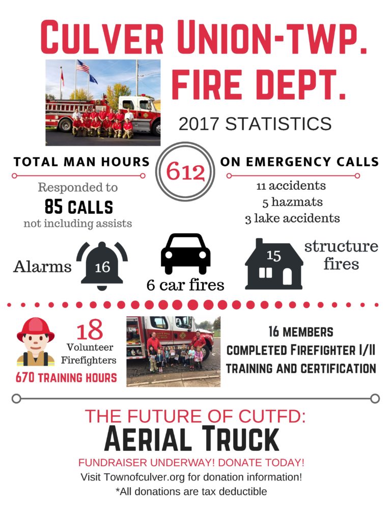 In October 2020, the Culver-Union Township Fire Department took delivery of its first aerial fire truck. The aerial truck not only is a huge benefit to the community with the capability of rescue structures above 25 feet, but it also is a symbol of how the community has invested in the department. The $1.2 million truck was purchased with the assistance of members of the community far and wide who saw the need and invested in the safety of Culver. For that, we say “Thank YOU!”