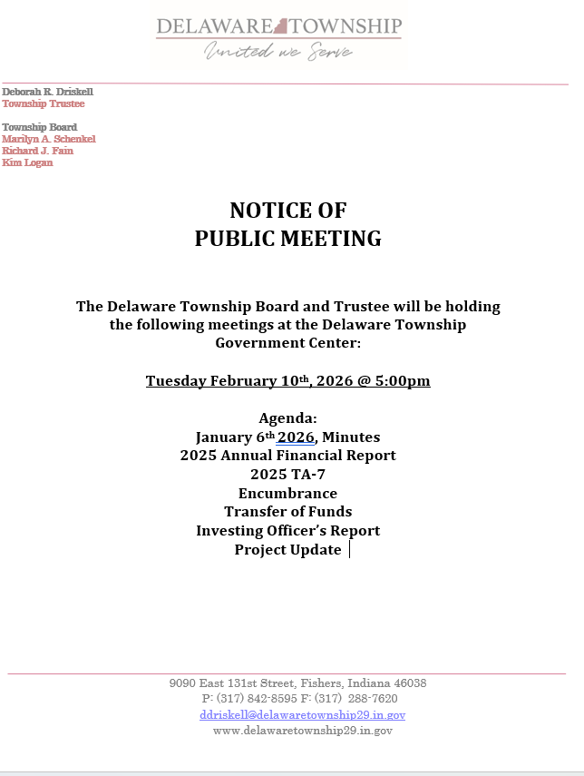 Email: ddriskell@delawaretownship29.in.gov