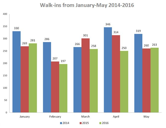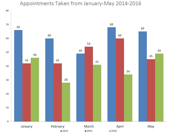 The charts and graphs below are intended to reflect this data, and were compiled by Case Investigator Laura Blaker. This information was retrieved from Township appointment books, sign-in sheets, and the computer system. Most of the data compiled compares the periods of January-May across 2014, 2015, and 2016.